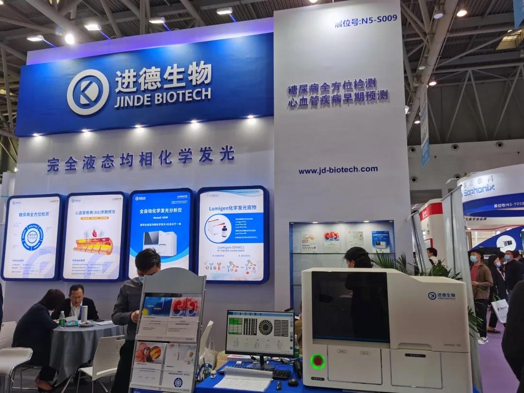 本次盛會(huì)進(jìn)德生物攜新品亮相,向業(yè)界展示了公司自主研發(fā)的全自動(dòng)化學(xué)發(fā)光分析儀及配套診斷試劑產(chǎn)品。全球首創(chuàng)的發(fā)光平臺(tái)、差異化的產(chǎn)品路線吸引了眾多客戶和業(yè)界同行駐足咨詢,公司工作人員熱情地為客戶答疑解惑,與客戶溝通交流,介紹產(chǎn)品性能和市場(chǎng)前景,現(xiàn)場(chǎng)氛圍熱烈。