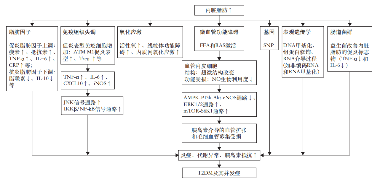 人體內(nèi)臟脂肪堆積引起的內(nèi)臟型肥胖被認(rèn)為是一種慢性低度炎癥狀態(tài)。在內(nèi)臟脂肪不斷積累會(huì)導(dǎo)致脂肪因子分泌改變和促炎脂肪因子上調(diào)。之后便會(huì)損傷血管內(nèi)皮、引起血管平滑肌功能障礙、促進(jìn)炎癥和氧化應(yīng)激和加重動(dòng)脈鈣化等,進(jìn)一步推動(dòng)心腦血管疾病的發(fā)展。