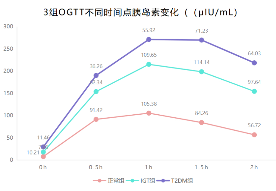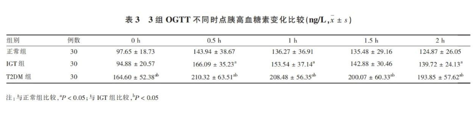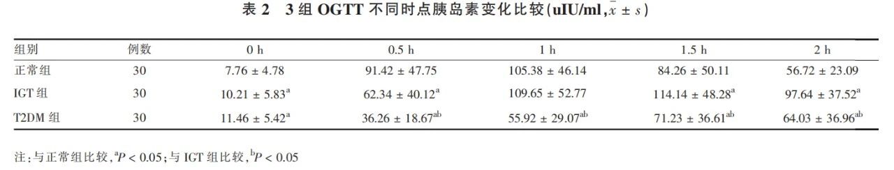 正常組胰島素平均最高值在糖負荷后1h,IGT組和T2DM組均延后,平均最高值出現(xiàn)在1.5h。T2DM組在各時點平均胰島素均低于正常組,在0.5h、1h、1.5h和2h的平均胰島素均低于IGT組,IGT組在0.5h低于正常組,在1h、1.5h和2h均高于正常組,差異均有統(tǒng)計學意義(P<0.05)。