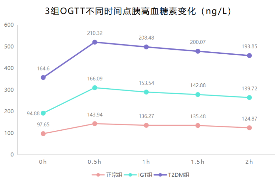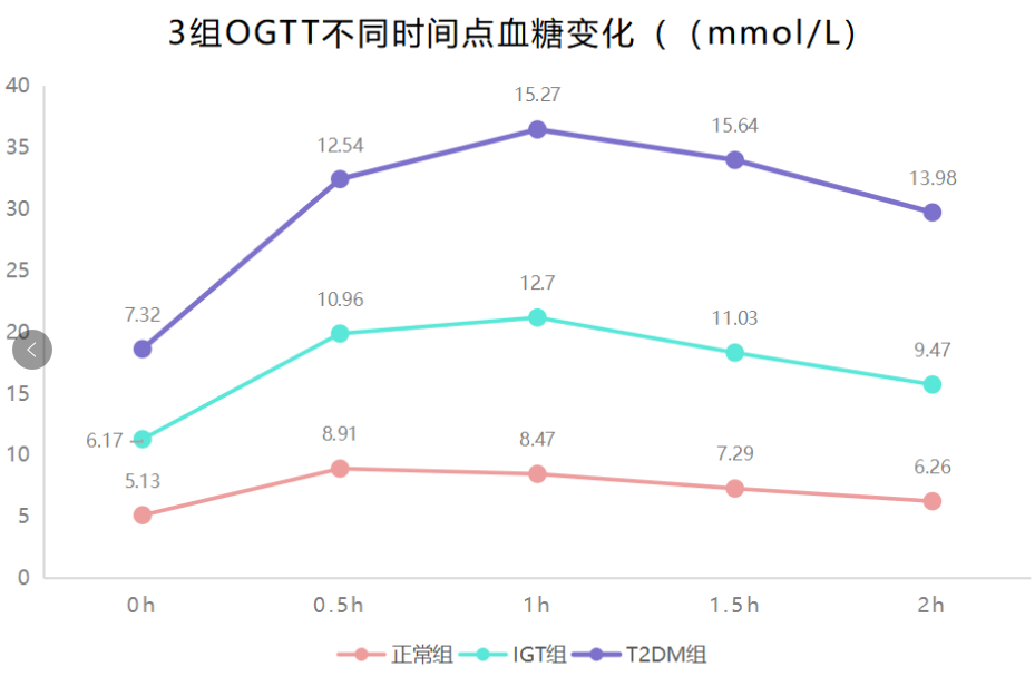 T2DM組在各時點平均血糖均高于正常組,在1h、1.5h和2h的平均血糖均高于IGT組,IGT組在0.5h、1h、1.5h和2h的平均血糖均高于正常組,差異均有統(tǒng)計學意義(P<0.05)。