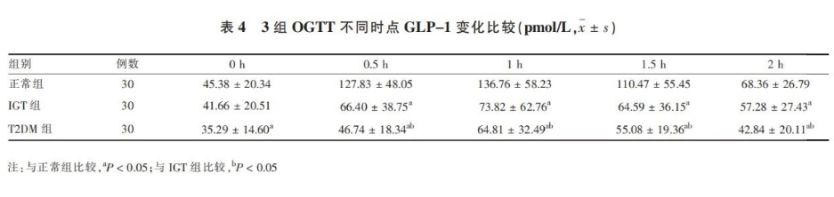T2DM組在各時點,IGT組在0.5h、1h、1.5h、2h的平均GLP-1低于正常組,T2DM組在0.5h、1h、1.5h、2h的平均GLP-1低于IGT組,組間差異有統(tǒng)計學意義(P<0.05)。