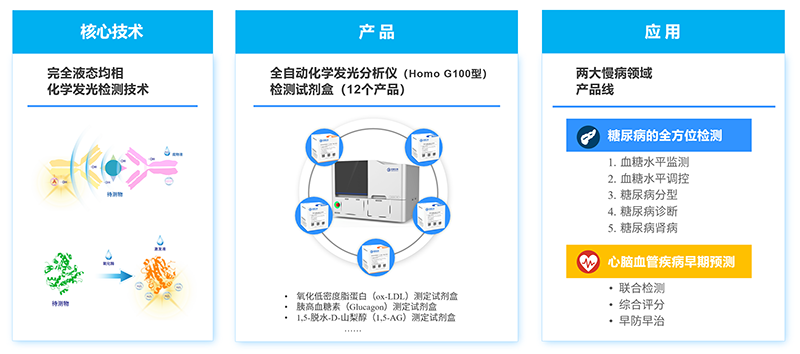 進(jìn)德生物專注于糖尿病、心腦血管疾病、肥胖等慢病領(lǐng)域體外診斷試劑及配套儀器的研發(fā)、生產(chǎn)和銷售?;谌蚴讋?chuàng)的完全液態(tài)均相化學(xué)發(fā)光檢測(cè)技術(shù)平臺(tái),開(kāi)發(fā)出HomoG100型全自動(dòng)化學(xué)發(fā)光分析儀,配套糖尿病的全方位檢測(cè)和心腦血管疾病早期預(yù)測(cè)等慢病領(lǐng)域系列檢測(cè)試劑,力求解決當(dāng)前臨床上慢病診療的痛點(diǎn)。