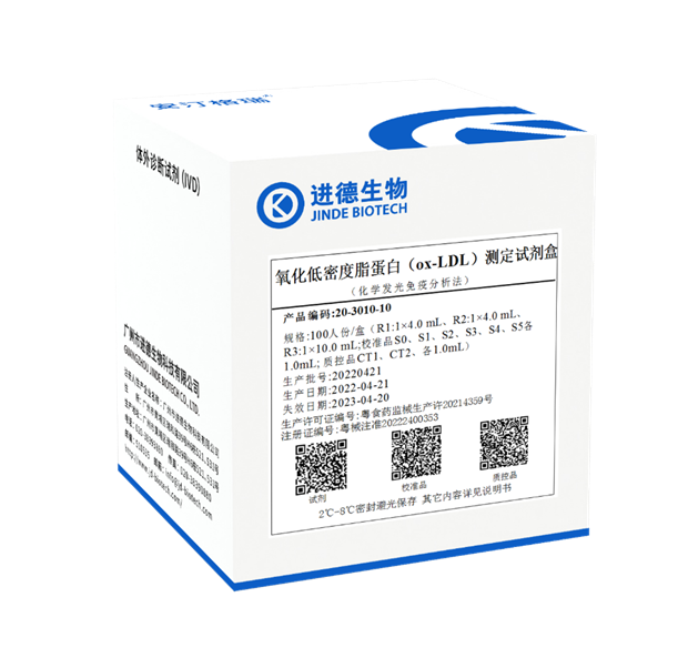 本期帶來由進(jìn)德生物自主研發(fā)生產(chǎn)的一款重磅產(chǎn)品氧化低密度脂蛋白(ox-LDL)測定試劑盒(化學(xué)發(fā)光免疫分析法),目前已獲批上市,注冊證號粵械注準(zhǔn)20222400353,該款產(chǎn)品為全球率先研發(fā)的化學(xué)發(fā)光法氧化低密度脂蛋白(ox-LDL)測定試劑盒。