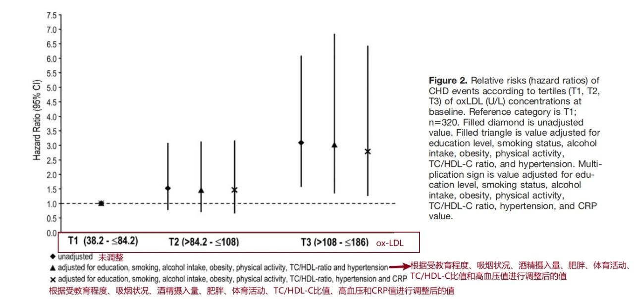 ②血漿中的循環(huán)ox-LDL是識(shí)別冠心病風(fēng)險(xiǎn)的一個(gè)有用的標(biāo)志物。在同一模型中同時(shí)評(píng)估ox-LDL時(shí),即使在調(diào)整了所有傳統(tǒng)心血管風(fēng)險(xiǎn)因素和TC/HDL-C比值(傳統(tǒng)血脂變量中最有力的風(fēng)險(xiǎn)預(yù)測(cè)因素之一)后,ox-LDL仍能預(yù)測(cè)未來的冠心病事件。