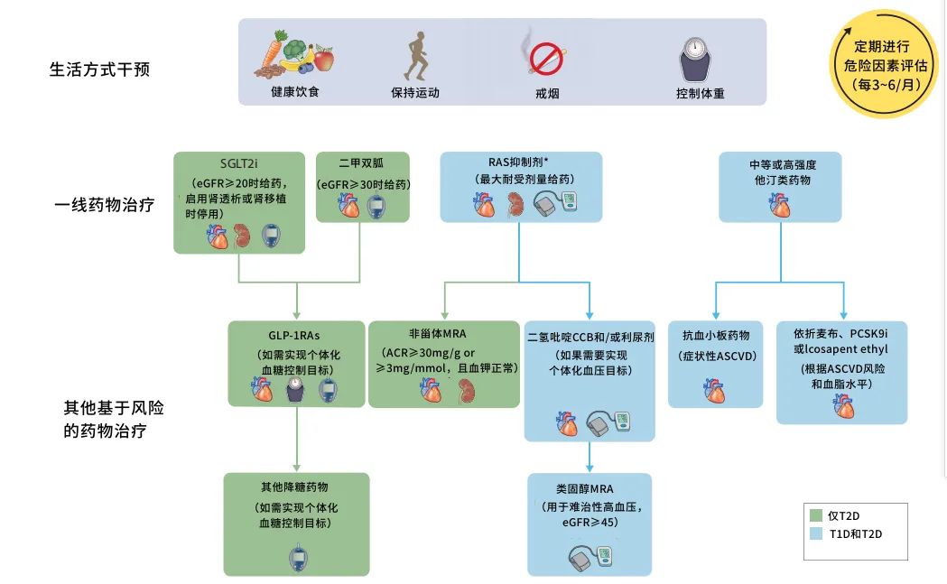 相關(guān)指南建議2型糖尿病和1型糖尿病(病程超過5年)患者應(yīng)每年至少檢查尿常規(guī)、UACR和血肌酐(計(jì)算eGFR)一次。同時(shí)重視對(duì)糖尿病腎病危險(xiǎn)因素的干預(yù),包括高血糖、高血壓、肥胖(尤其是腹型肥胖),避免腎毒性藥物及食物、急性腎損傷、蛋白攝入過多。研究表明,良好的生活方式、有效的血糖和血壓控制是防治糖尿病腎病的關(guān)鍵。