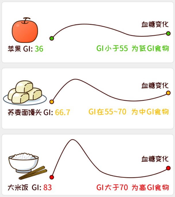 高GI食物:GI≥70。高GI食物進(jìn)入胃腸后消化速度快,吸收完全,餐后血糖峰值高。
